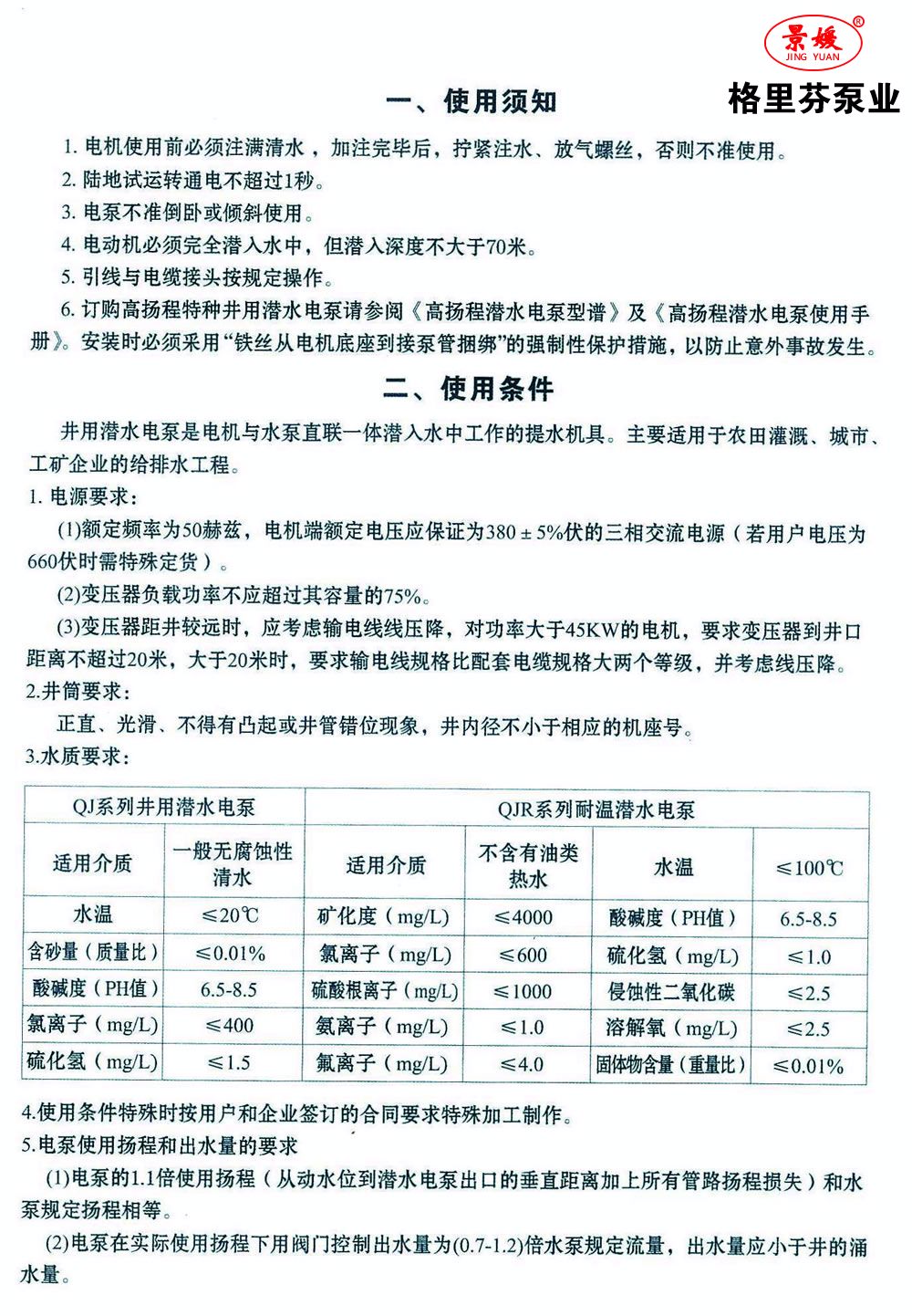 QJ型井用潛水電泵是潛水電機與潛水泵直聯(lián)一體,潛入水中工作的提水機具。主要適用于農(nóng)田灌溉,城市、工礦企業(yè)的給排水工程。QJR型潛水電泵適用于水溫流量:2-1000m3/h,揚程:10m-1000m,電機功率:0.55KW-600KW,額定電壓:380V/660V。